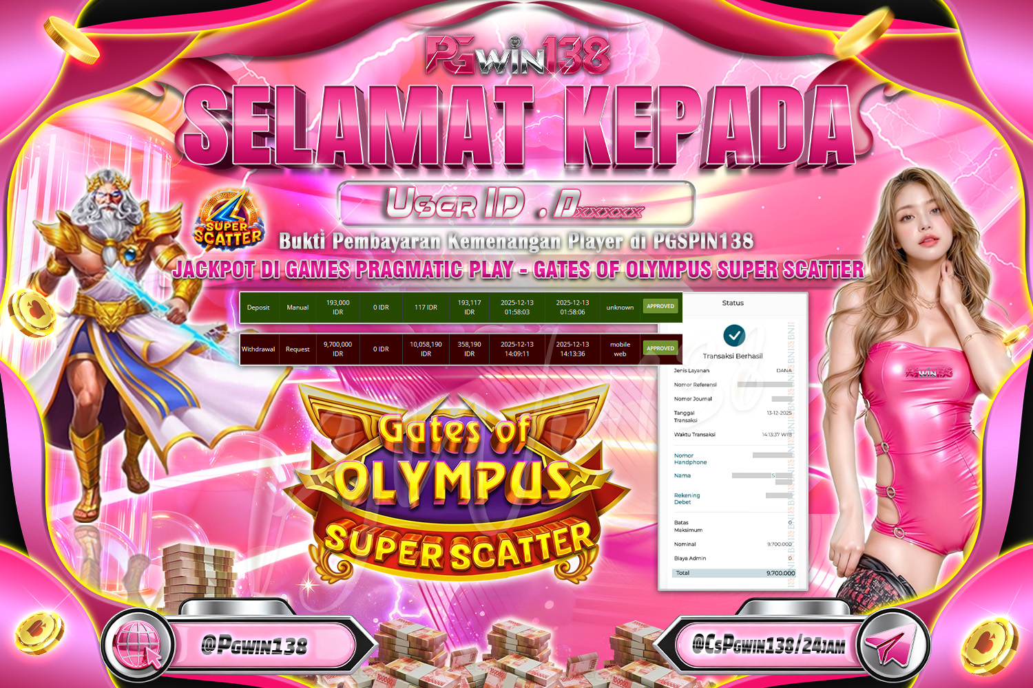 Selamat Kepada Pemenang Jackpot Hari Ini ,Dengan bukti pembayaran ini PGWIN138 memberikan bukti komitmen sebagai Bandar Slot Gacor Terpercaya 100% membayar lunas,Dan bukti di atas sebagai pernyataan setiap kemenangan selalu terbayarkan oleh PGWIN138